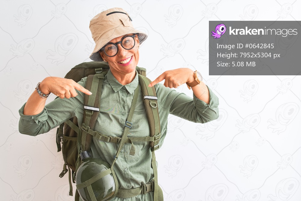 Middle age hiker woman wearing backpack canteen hat glasses over isolated white background looking confident with smile on face, pointing oneself with fingers proud and happy. - Kraken Images