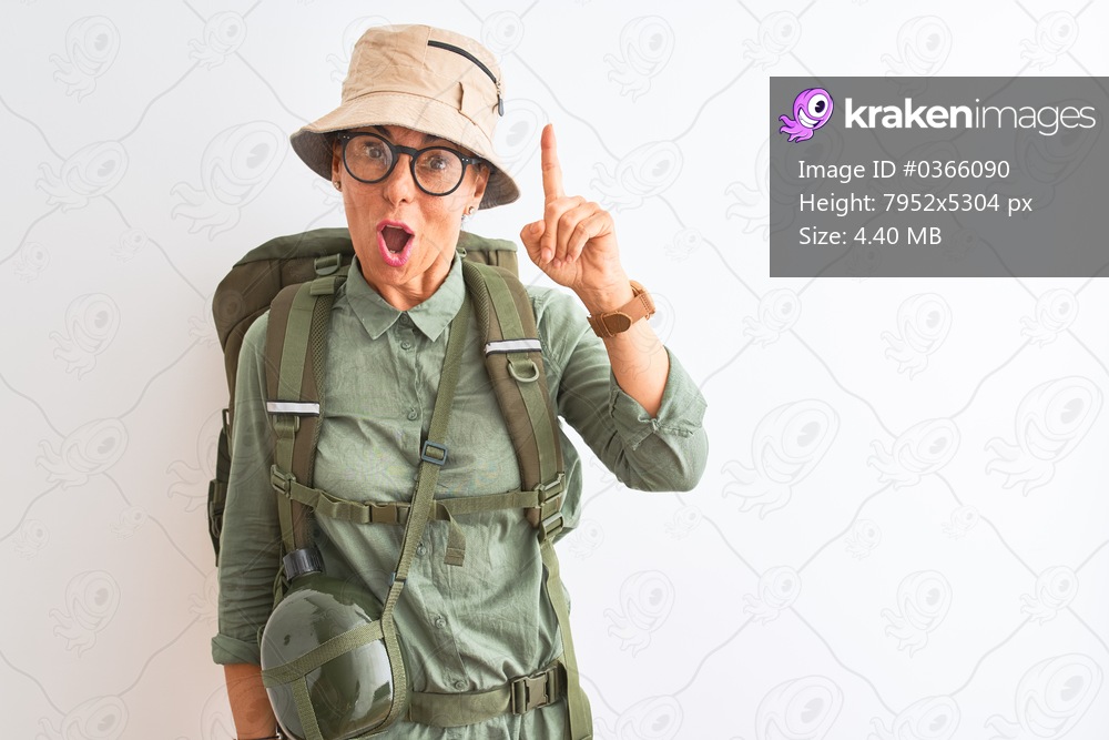 Middle age hiker woman wearing backpack canteen hat glasses over isolated white background pointing finger up with successful idea. Exited and happy. Number one. - Kraken Images