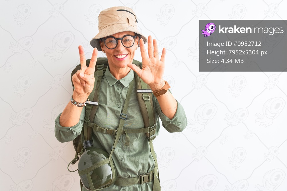 Middle age hiker woman wearing backpack canteen hat glasses over isolated white background showing and pointing up with fingers number seven while smiling confident and happy. - Kraken Images