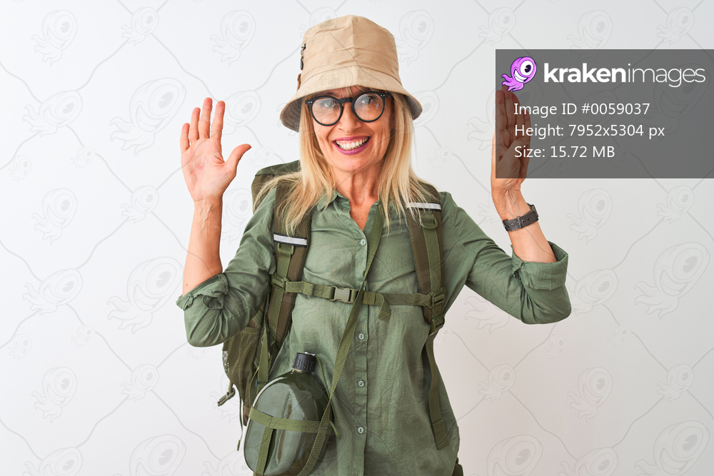Middle age hiker woman wearing backpack hat canteen glasses over isolated white background showing and pointing up with fingers number nine while smiling confident and happy. - Kraken Images