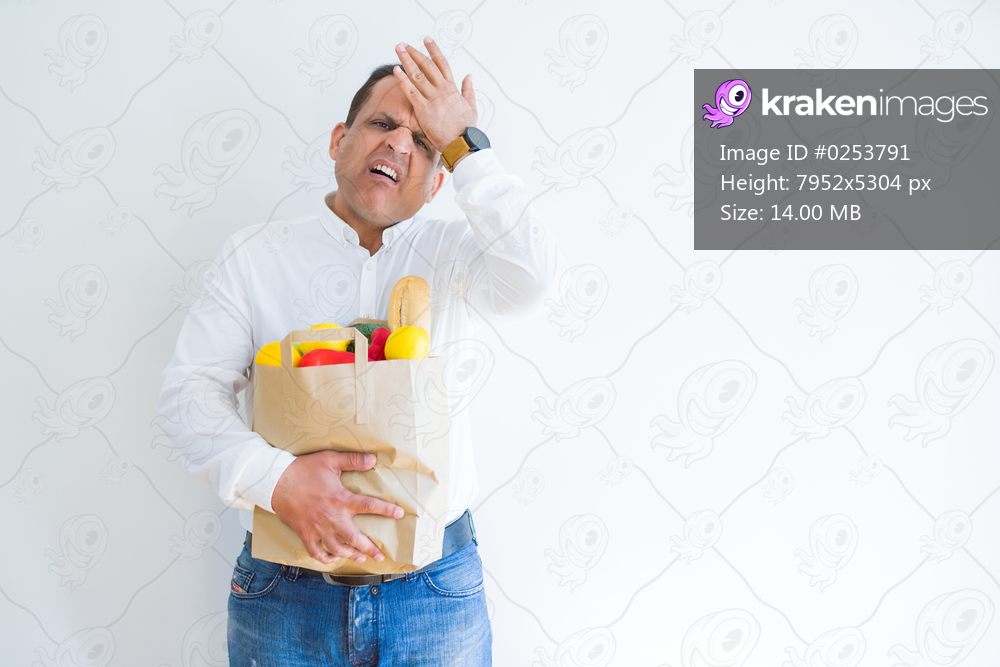 Middle age man holding groceries shopping bag over white background stressed with hand on head, shocked with shame and surprise face, angry and frustrated. Fear and upset for mistake. - Kraken Images