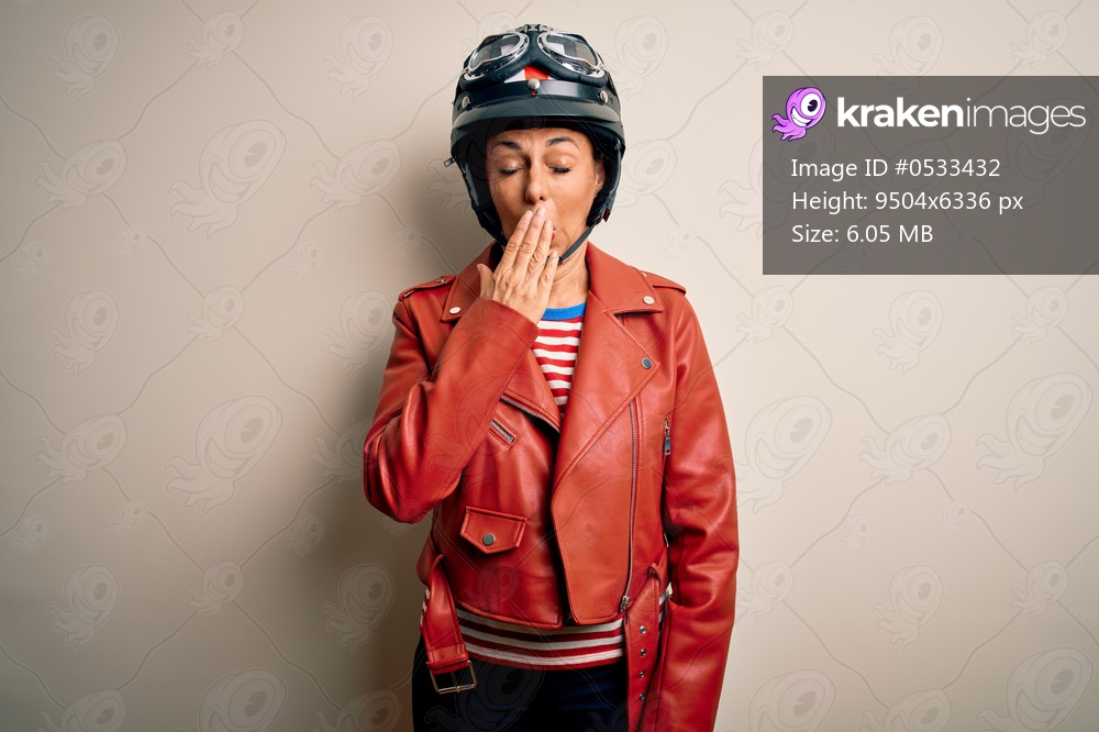 Middle age motorcyclist woman wearing motorcycle helmet and jacket over white background bored yawning tired covering mouth with hand. Restless and sleepiness. - Kraken Images