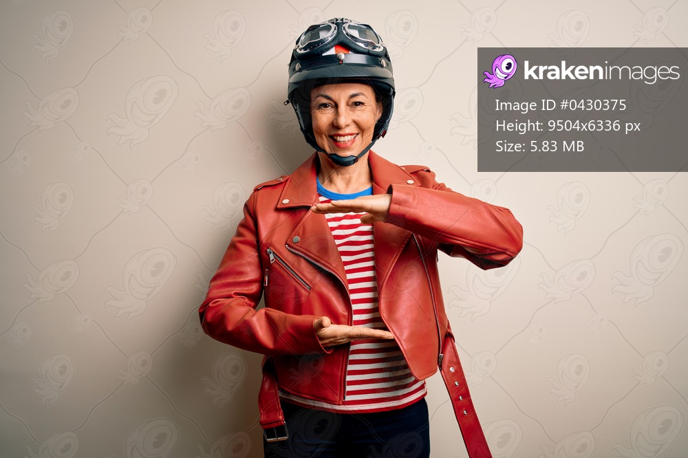 Middle age motorcyclist woman wearing motorcycle helmet and jacket over white background gesturing with hands showing big and large size sign, measure symbol. Smiling looking at the camera. Measuring concept. - Kraken Images
