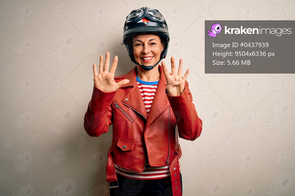 Middle age motorcyclist woman wearing motorcycle helmet and jacket over white background showing and pointing up with fingers number nine while smiling confident and happy. - Kraken Images