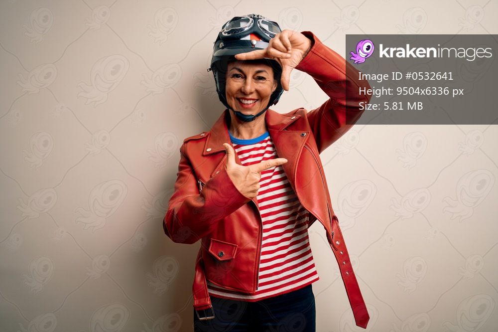 Middle age motorcyclist woman wearing motorcycle helmet and jacket over white background smiling making frame with hands and fingers with happy face. Creativity and photography concept. - Kraken Images