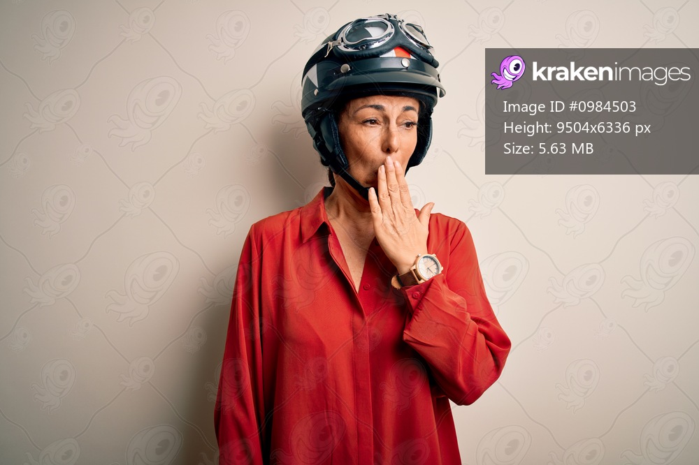 Middle age motorcyclist woman wearing motorcycle helmet over isolated white background bored yawning tired covering mouth with hand. Restless and sleepiness. - Kraken Images