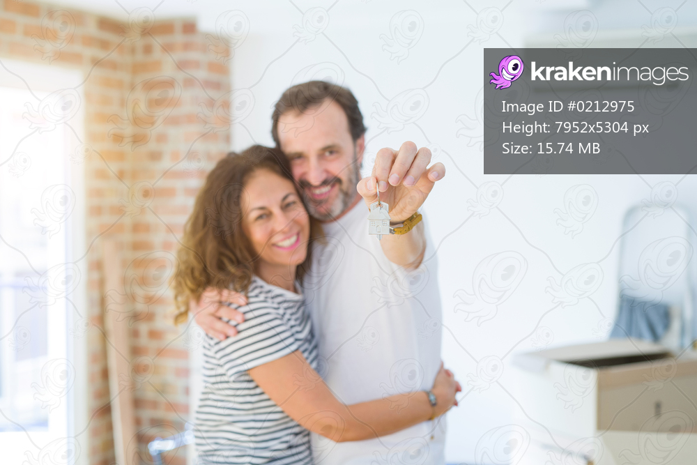 Middle age senior romantic couple holding and showing house keys, hugging and smiling happy for moving to a new home