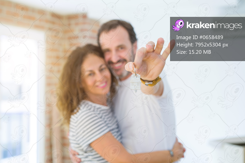 Middle age senior romantic couple holding and showing house keys, hugging and smiling happy for moving to a new home