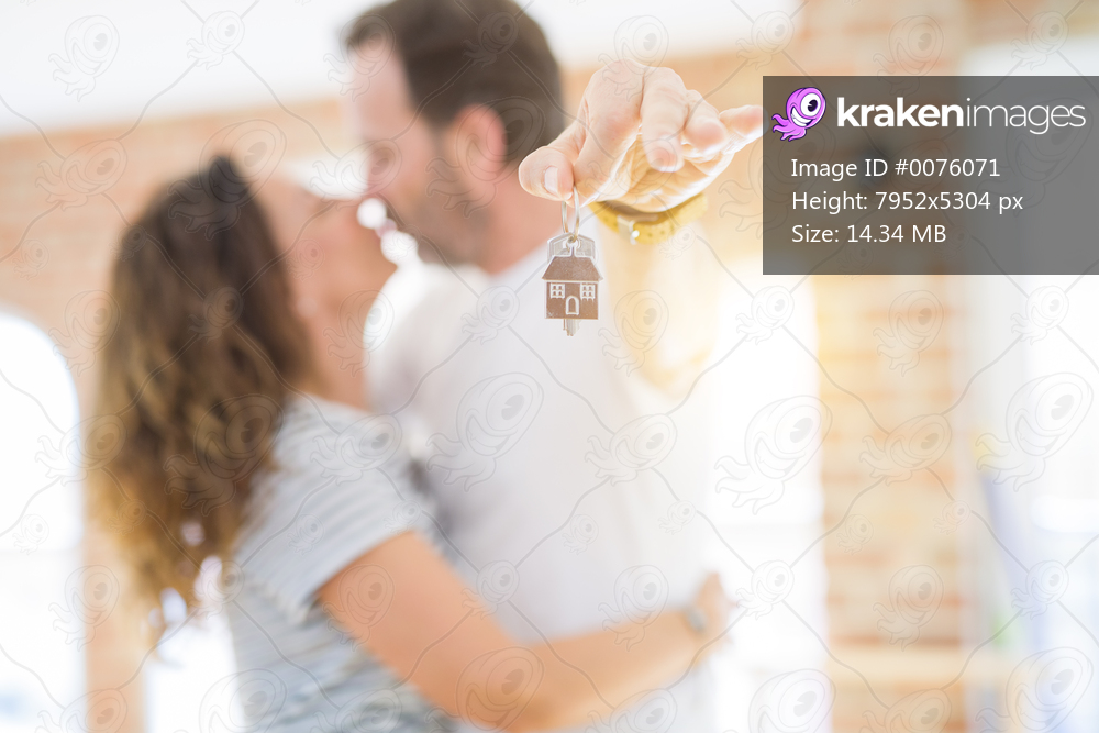 Middle age senior romantic couple holding and showing house keys, hugging and smiling happy for moving to a new home