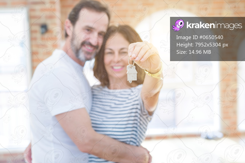Middle age senior romantic couple holding and showing house keys smiling happy for moving to a new home