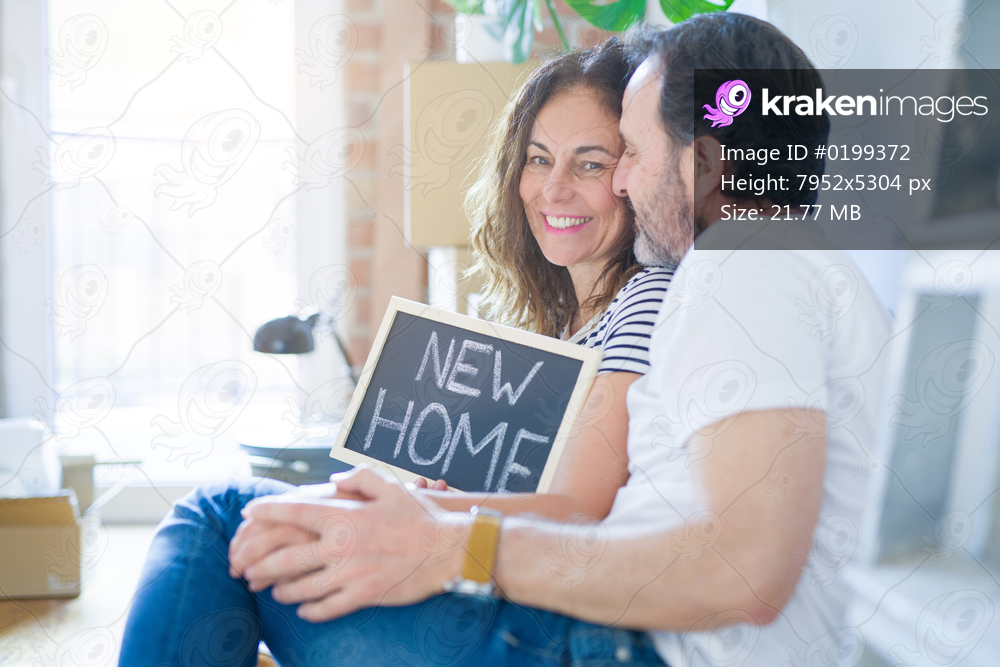 Middle age senior romantic couple in love sitting on the apartment floor with boxes around and showing blackboard smiling happy for moving to a new home