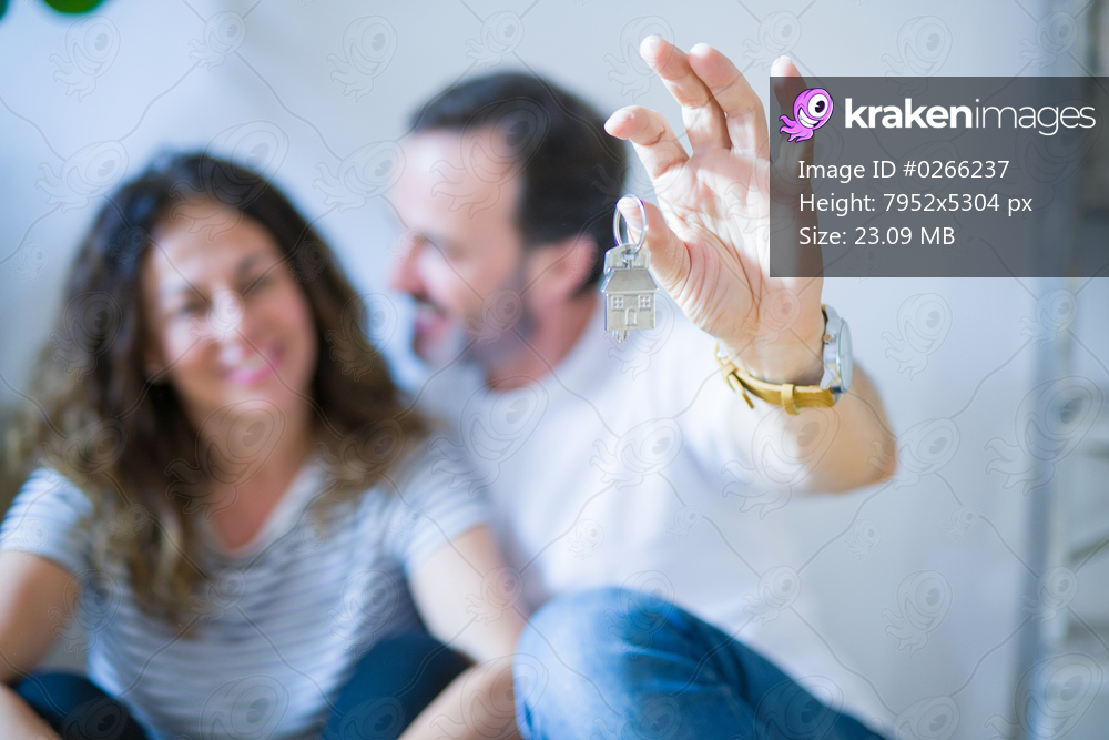 Middle age senior romantic couple in love sitting on the apartment floor with cardboard boxes around and showing house keys smiling happy for moving to a new home - Kraken Images