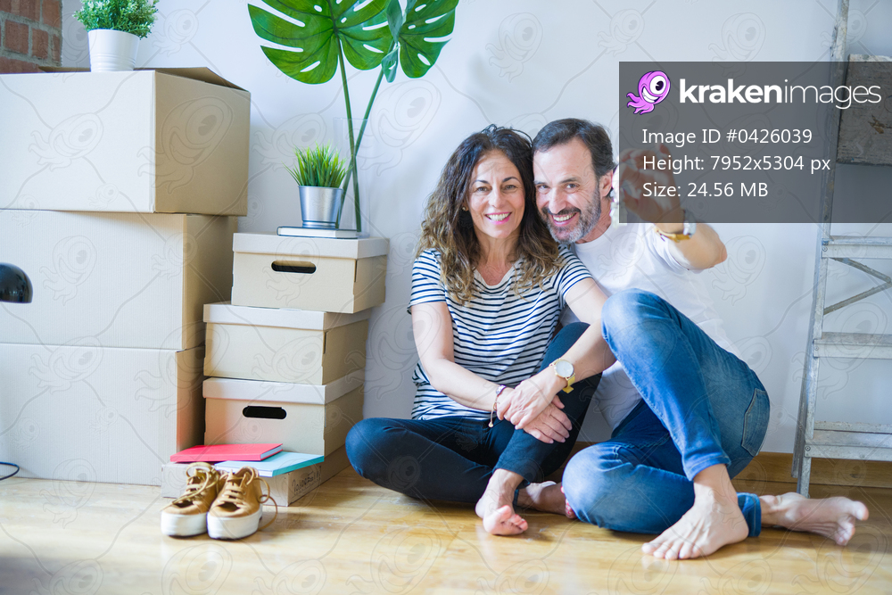 Middle age senior romantic couple in love sitting on the apartment floor with cardboard boxes around and showing house keys smiling happy for moving to a new home - Kraken Images
