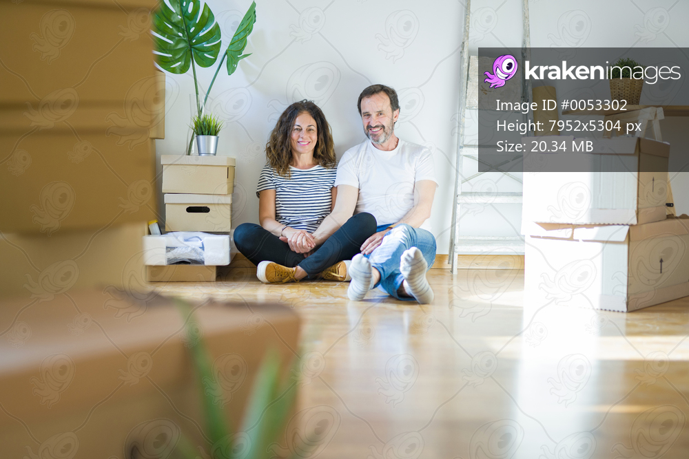 Middle age senior romantic couple in love sitting on the apartment floor with cardboard boxes around and smiling happy for moving to a new home