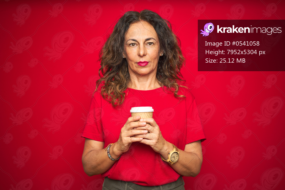 Middle age senior woman drinking a cup of coffee over red isolated background with a confident expression on smart face thinking serious