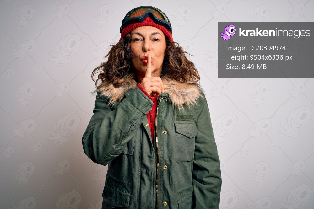 Middle age skier woman wearing snow sportswear and ski goggles over white background asking to be quiet with finger on lips. Silence and secret concept. - Kraken Images