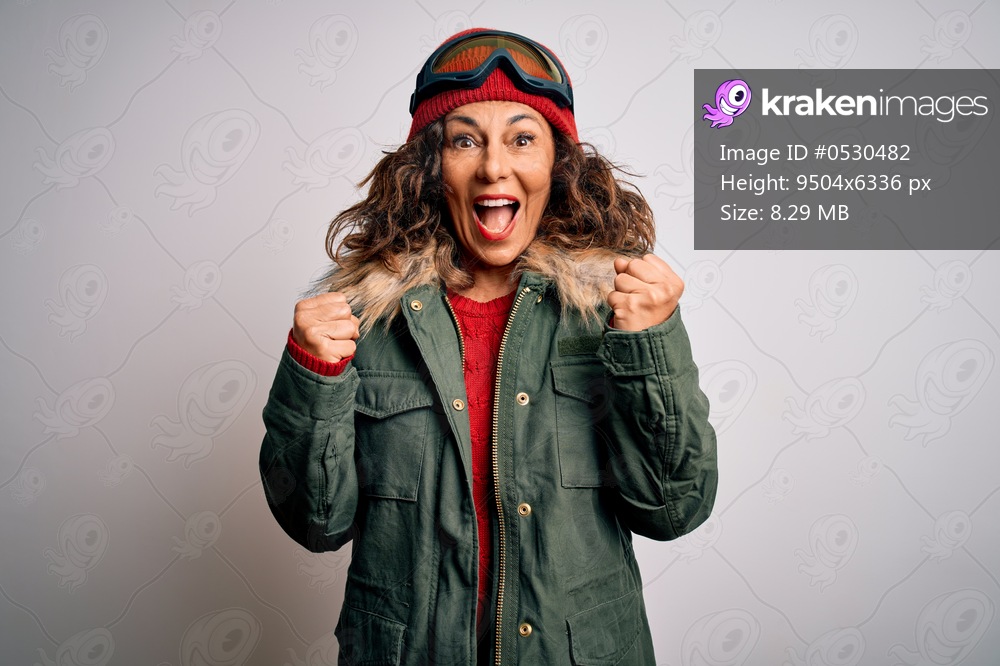 Middle age skier woman wearing snow sportswear and ski goggles over white background celebrating surprised and amazed for success with arms raised and open eyes. Winner concept. - Kraken Images