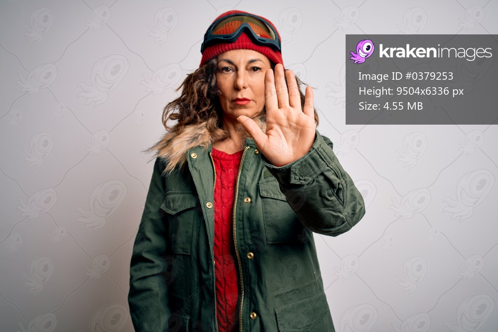Middle age skier woman wearing snow sportswear and ski goggles over white background doing stop sing with palm of the hand. Warning expression with negative and serious gesture on the face. - Kraken Images