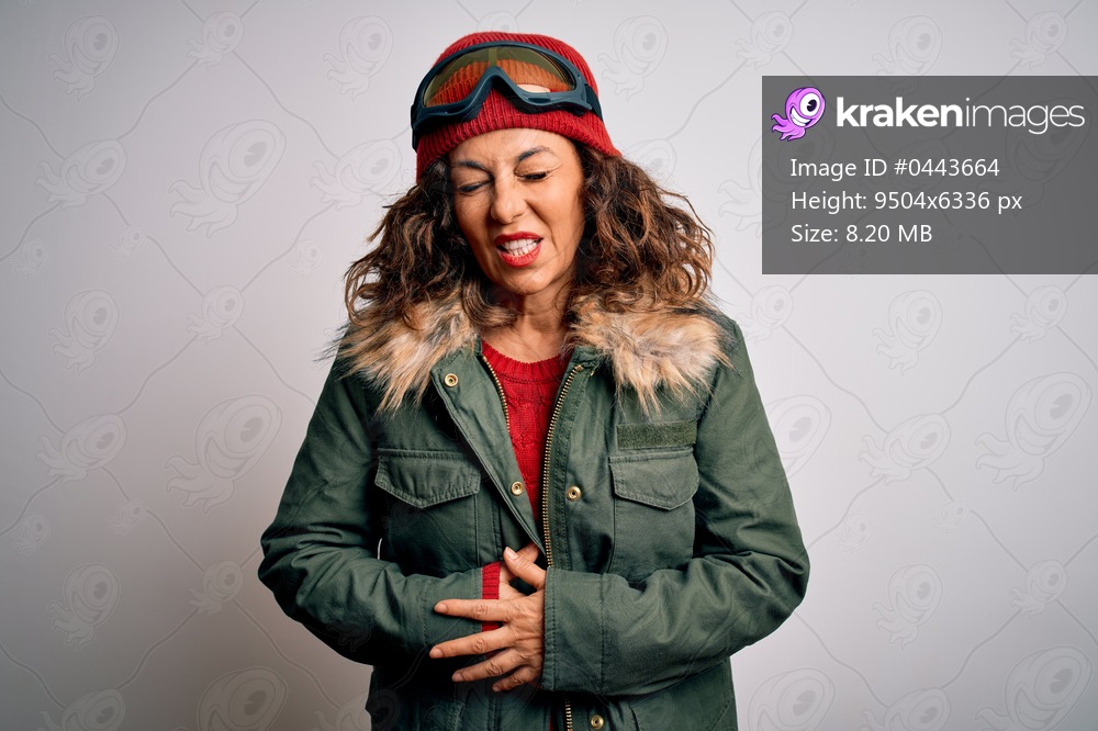 Middle age skier woman wearing snow sportswear and ski goggles over white background with hand on stomach because indigestion, painful illness feeling unwell. Ache concept. - Kraken Images