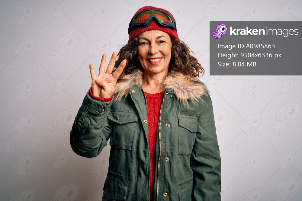 Middle age skier woman wearing snow sportswear and ski goggles over white background showing and pointing up with fingers number four while smiling confident and happy. - Kraken Images