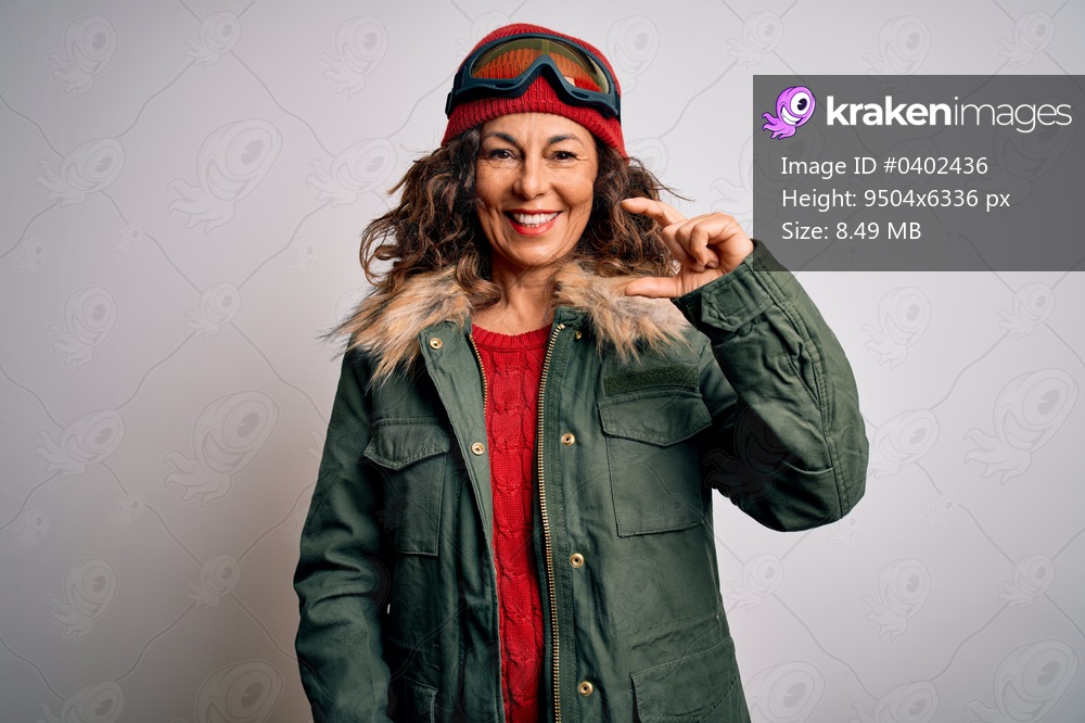 Middle age skier woman wearing snow sportswear and ski goggles over white background smiling and confident gesturing with hand doing small size sign with fingers looking and the camera. Measure concept. - Kraken Images