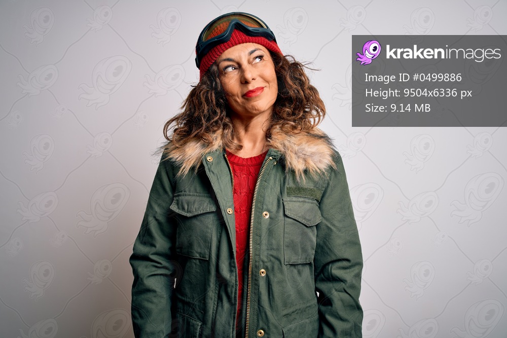 Middle age skier woman wearing snow sportswear and ski goggles over white background smiling looking to the side and staring away thinking.