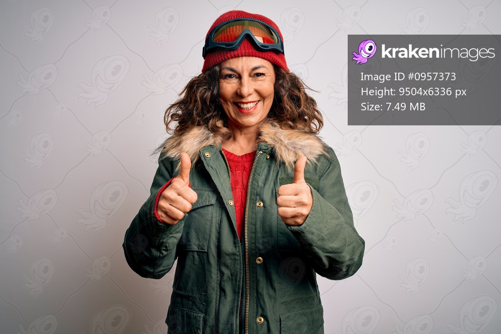 Middle age skier woman wearing snow sportswear and ski goggles over white background success sign doing positive gesture with hand, thumbs up smiling and happy. Cheerful expression and winner gesture. - Kraken Images