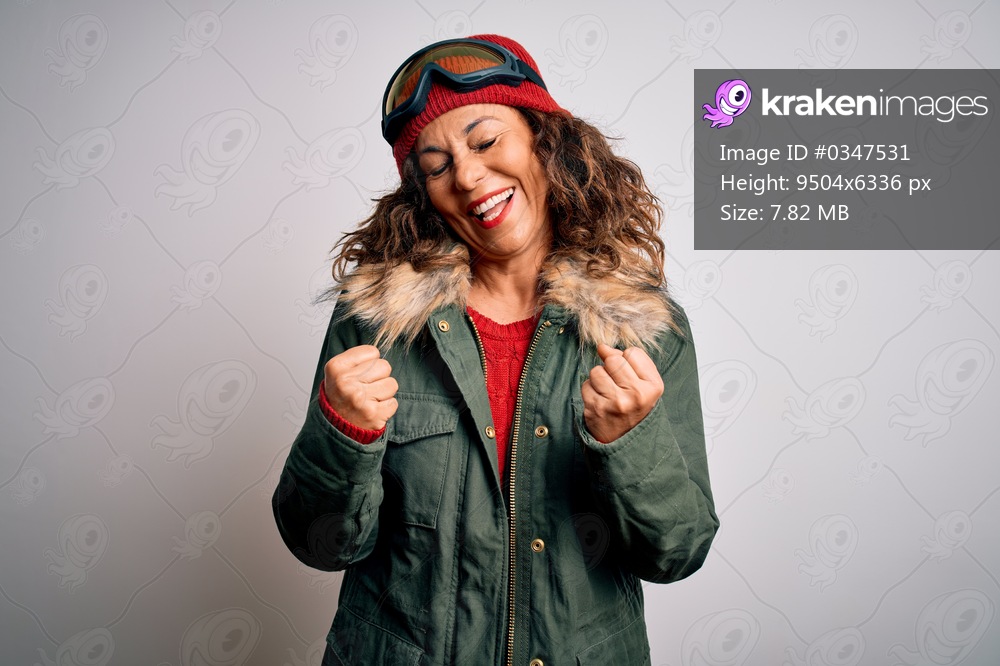 Middle age skier woman wearing snow sportswear and ski goggles over white background very happy and excited doing winner gesture with arms raised, smiling and screaming for success. Celebration concept. - Kraken Images