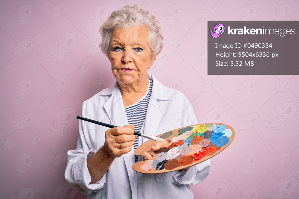 Senior beautiful grey-haired artist woman painting using brush and palette over pink background with a confident expression on smart face thinking serious - Kraken Images