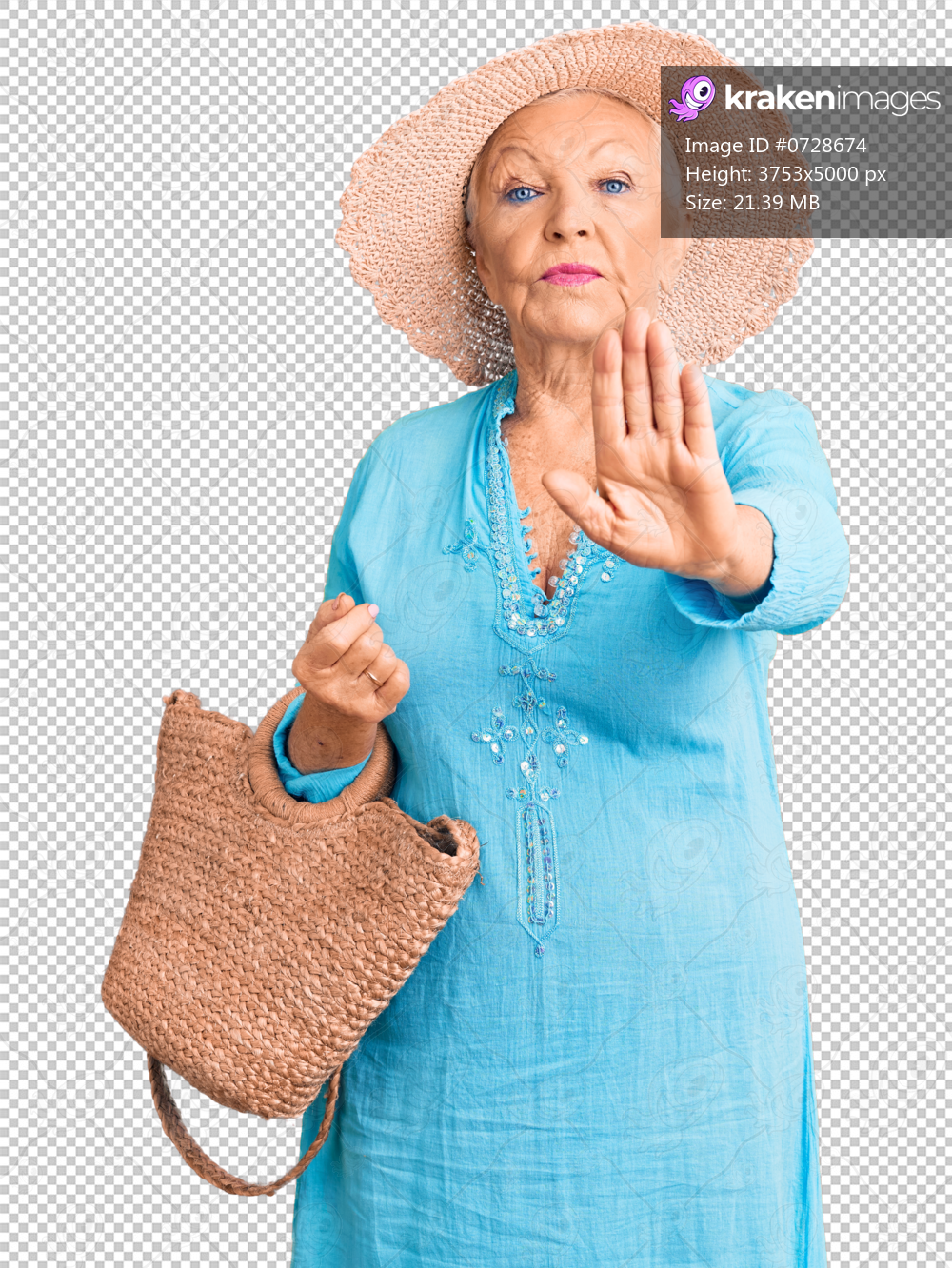 Senior beautiful woman with blue eyes and grey hair wearing fashion dress and hat holding summer wicker handbag with open hand doing stop sign with serious and confident expression, defense gesture - Kraken Images