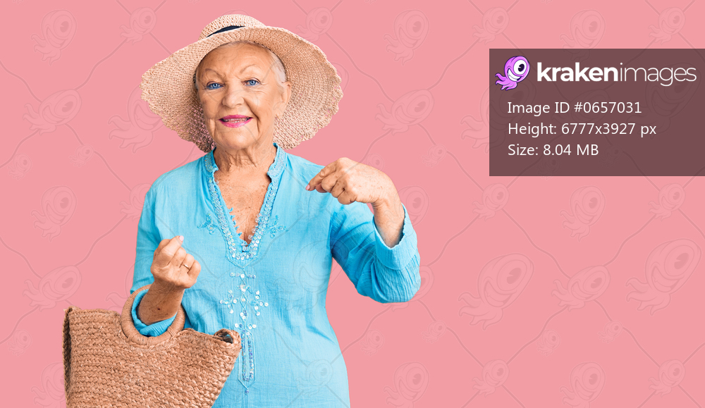 Senior beautiful woman with blue eyes and grey hair wearing fashion dress and hat holding summer wicker handbag pointing finger to one self smiling happy and proud - Kraken Images
