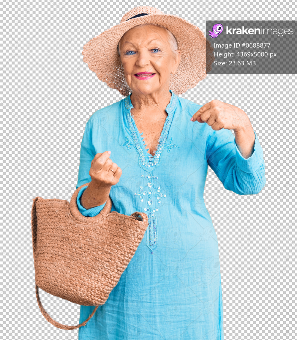 Senior beautiful woman with blue eyes and grey hair wearing fashion dress and hat holding summer wicker handbag pointing finger to one self smiling happy and proud - Kraken Images