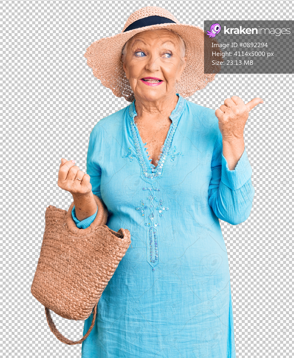 Senior beautiful woman with blue eyes and grey hair wearing fashion dress and hat holding summer wicker handbag pointing thumb up to the side smiling happy with open mouth - Kraken Images