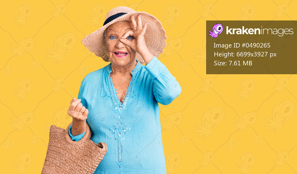 Senior beautiful woman with blue eyes and grey hair wearing fashion dress and hat holding summer wicker handbag smiling happy doing ok sign with hand on eye looking through fingers - Kraken Images