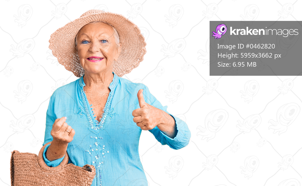 Senior beautiful woman with blue eyes and grey hair wearing fashion dress and hat holding summer wicker handbag smiling happy and positive, thumb up doing excellent and approval sign - Kraken Images
