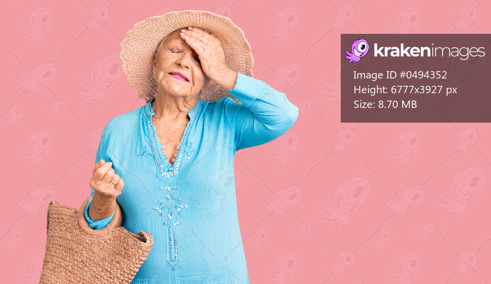 Senior beautiful woman with blue eyes and grey hair wearing fashion dress and hat holding summer wicker handbag stressed and frustrated with hand on head, surprised and angry face - Kraken Images