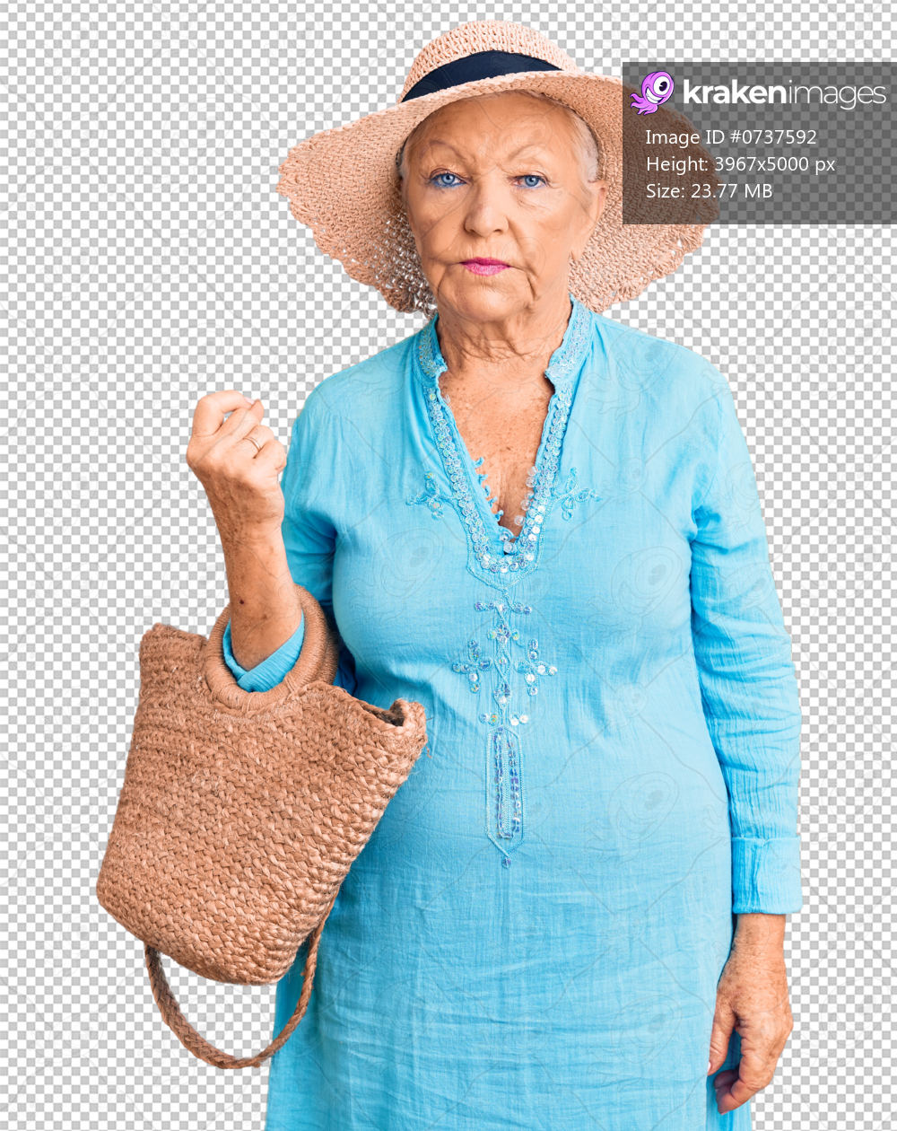 Senior beautiful woman with blue eyes and grey hair wearing fashion dress and hat holding summer wicker handbag thinking attitude and sober expression looking self confident - Kraken Images