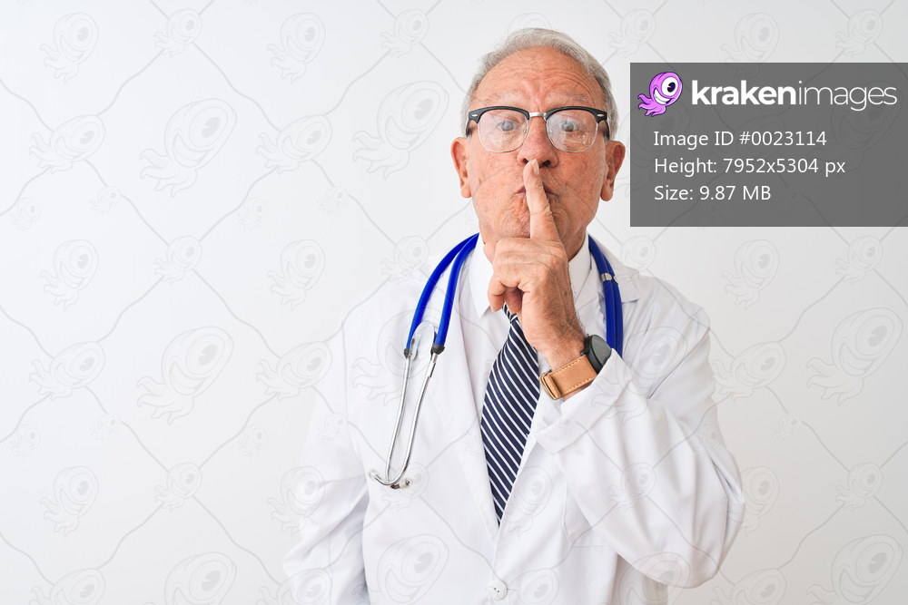 Senior grey-haired doctor man wearing stethoscope standing over isolated white background asking to be quiet with finger on lips. Silence and secret concept. - Kraken Images