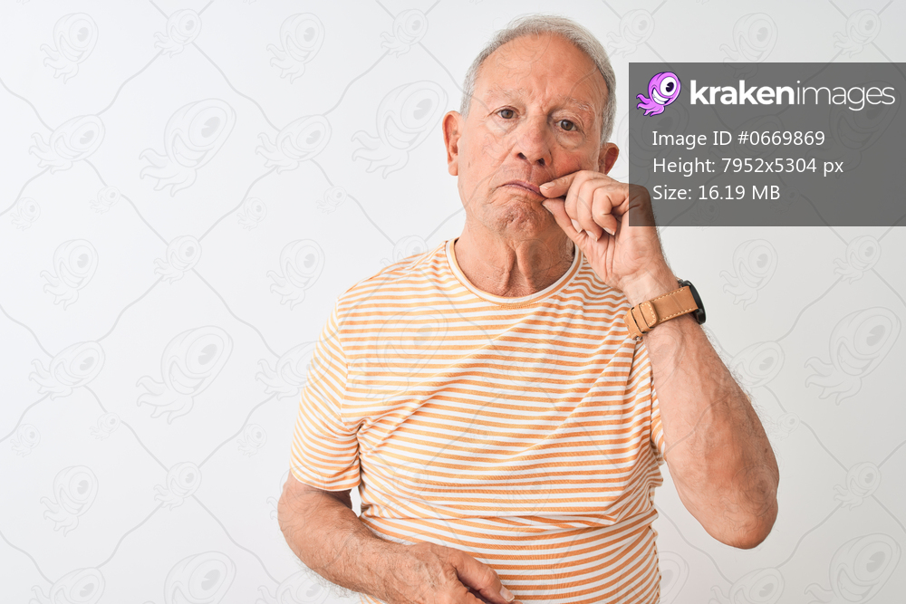 Senior grey-haired man wearing striped t-shirt standing over isolated white background mouth and lips shut as zip with fingers. Secret and silent, taboo talking - Kraken Images