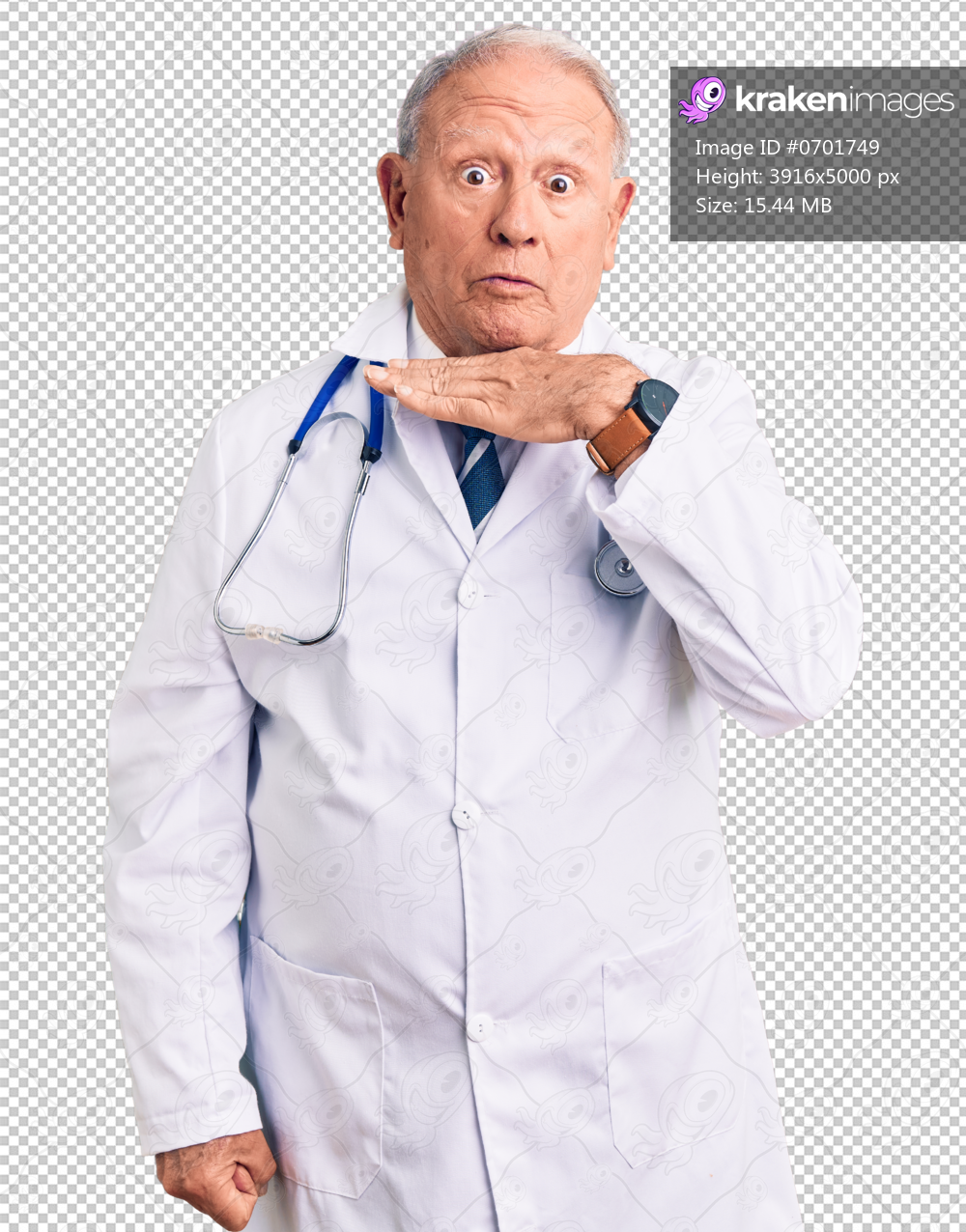 Senior handsome grey-haired man wearing doctor coat and stethoscope cutting throat with hand as knife, threaten aggression with furious violence