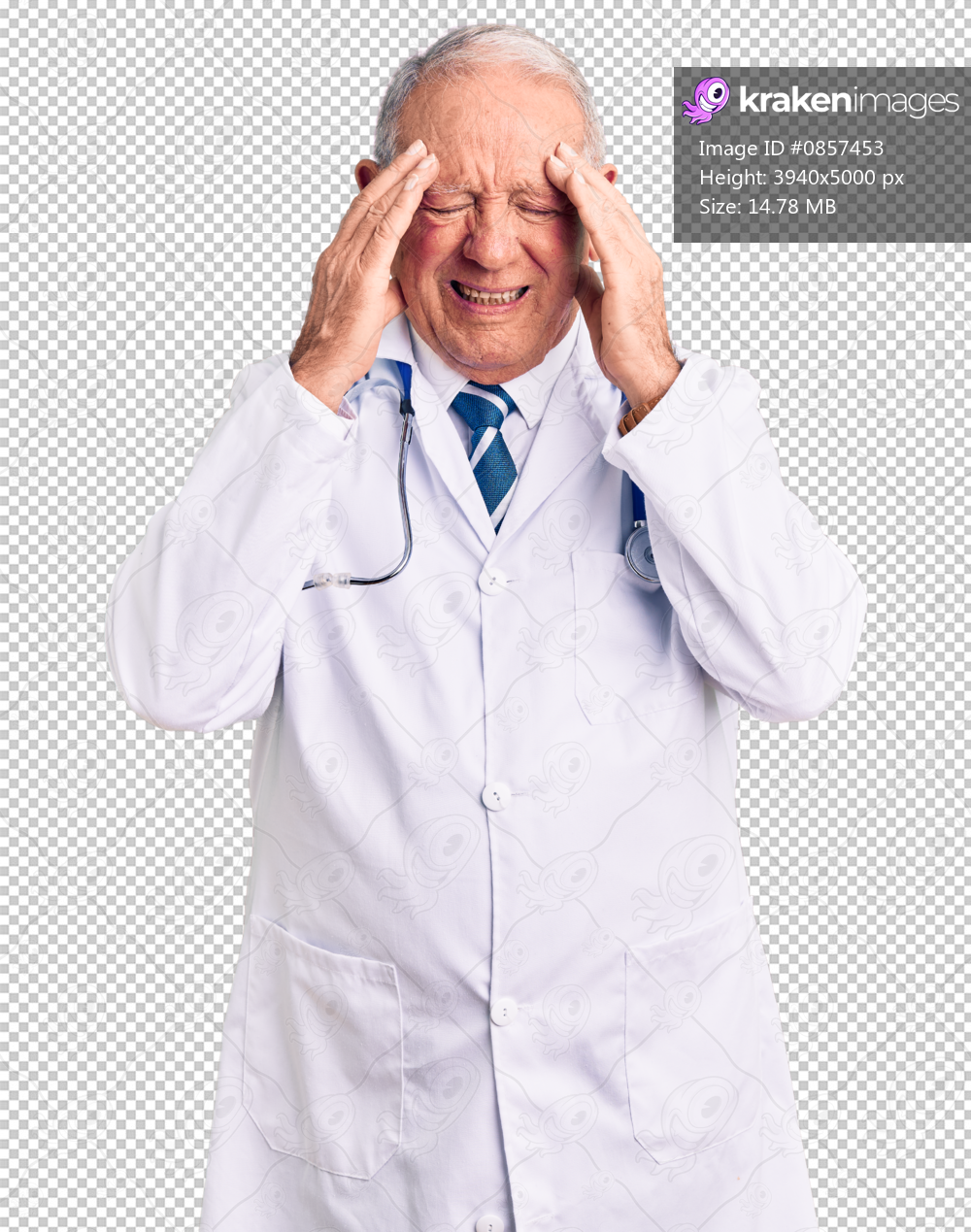 Senior handsome grey-haired man wearing doctor coat and stethoscope with hand on head, headache because stress. suffering migraine.
