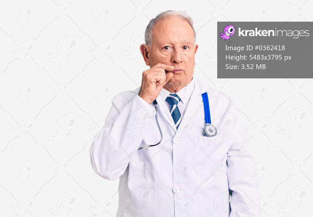 Senior handsome grey-haired man wearing doctor coat and stethoscope mouth and lips shut as zip with fingers. secret and silent, taboo talking