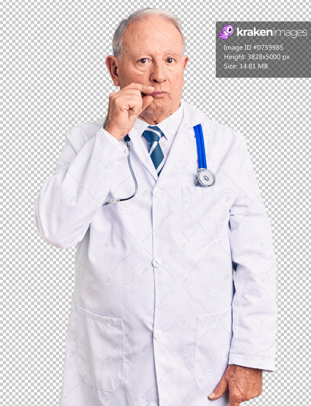 Senior handsome grey-haired man wearing doctor coat and stethoscope mouth and lips shut as zip with fingers. secret and silent, taboo talking