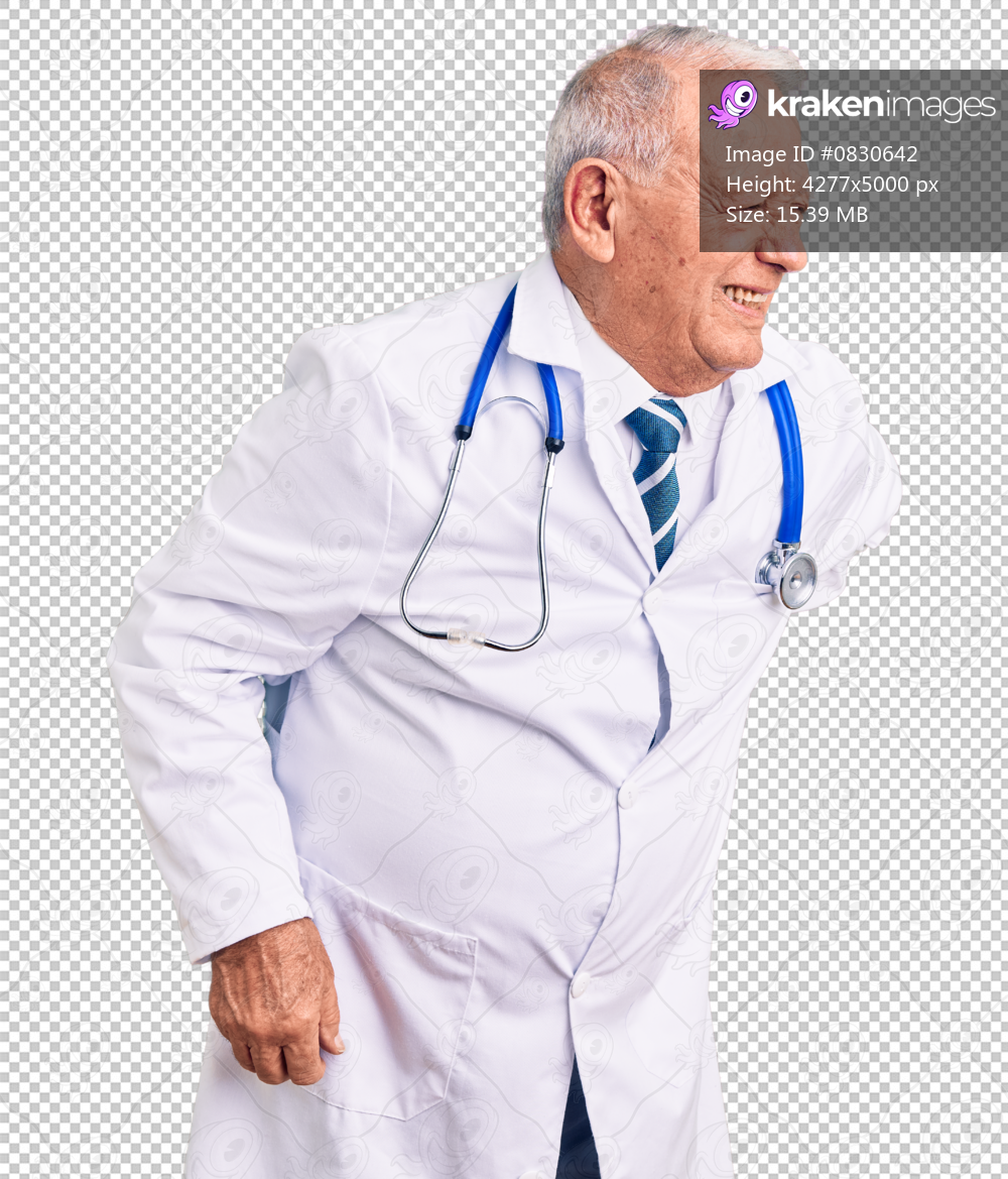 Senior handsome grey-haired man wearing doctor coat and stethoscope suffering of backache, touching back with hand, muscular pain