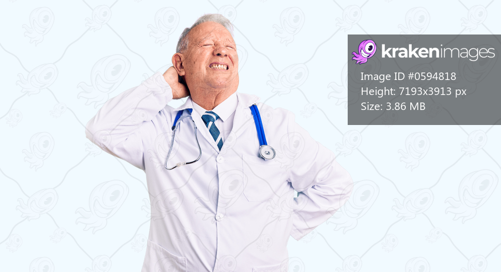 Senior handsome grey-haired man wearing doctor coat and stethoscope suffering of neck ache injury, touching neck with hand, muscular pain