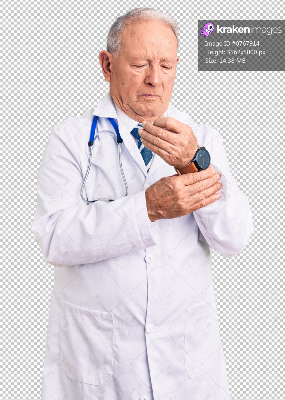 Senior handsome grey-haired man wearing doctor coat and stethoscope suffering pain on hands and fingers, arthritis inflammation