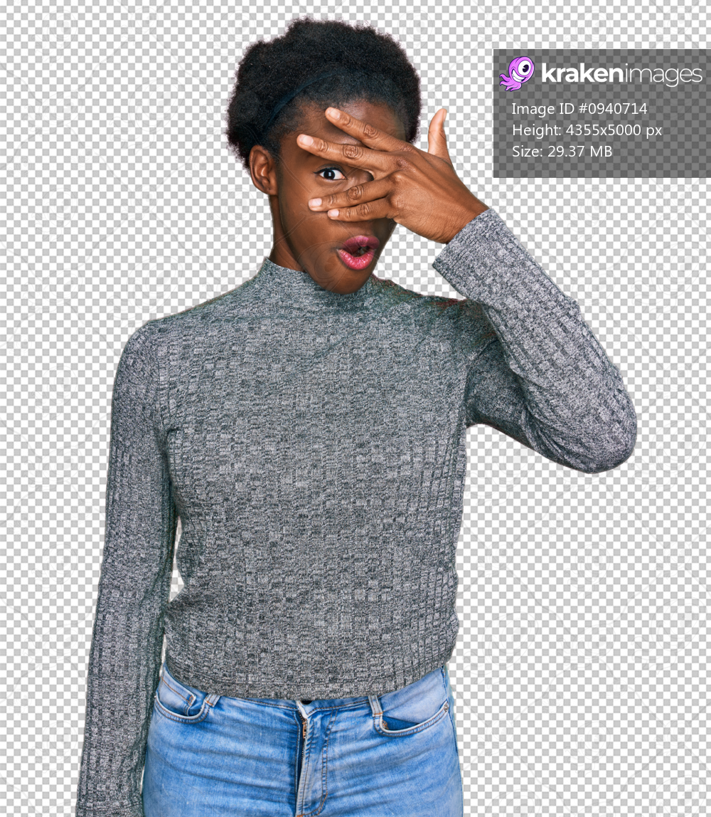 Young african american girl wearing casual clothes peeking in shock covering face and eyes with hand, looking through fingers with embarrassed expression. - Kraken Images