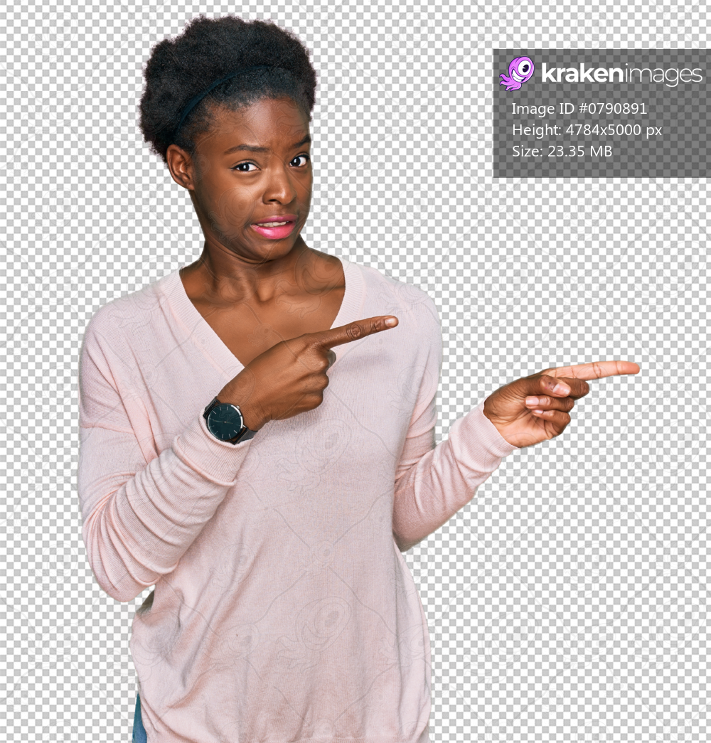 Young african american girl wearing casual clothes pointing aside worried and nervous with both hands, concerned and surprised expression