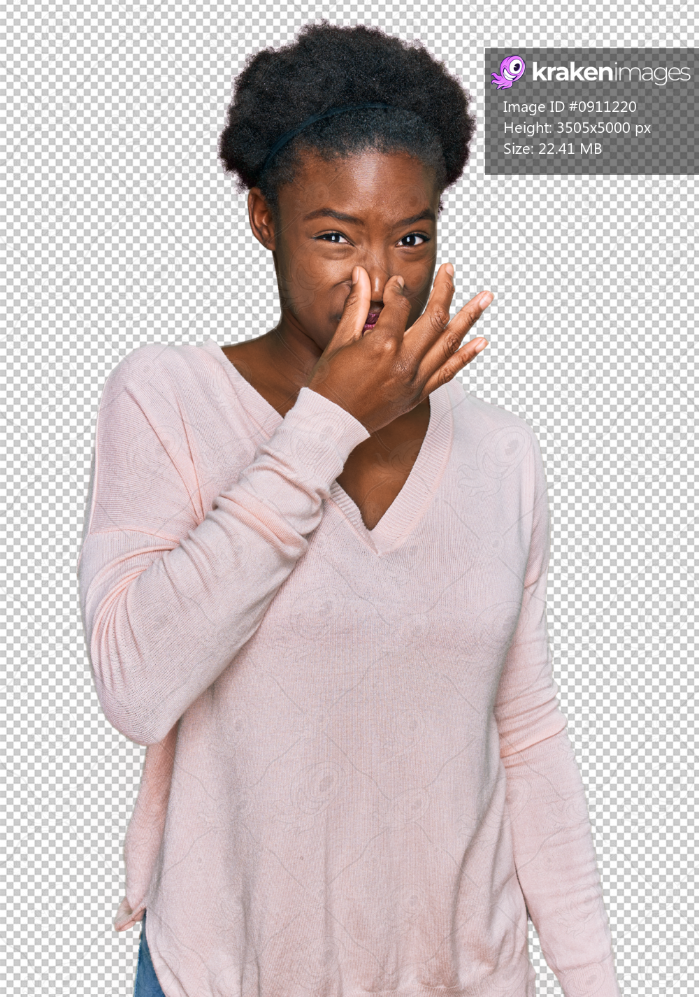 Young african american girl wearing casual clothes smelling something stinky and disgusting, intolerable smell, holding breath with fingers on nose. bad smell - Kraken Images
