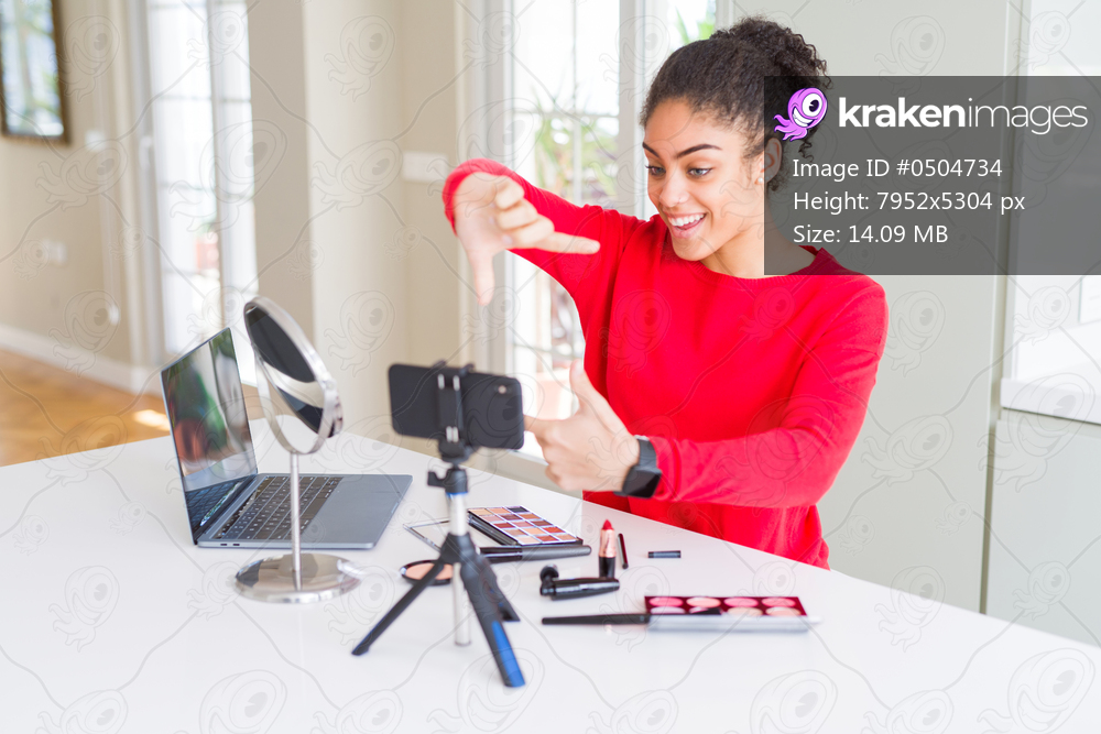 Young african american influencer woman recording make up tutorial smiling making frame with hands and fingers with happy face. Creativity and photography concept. - Kraken Images